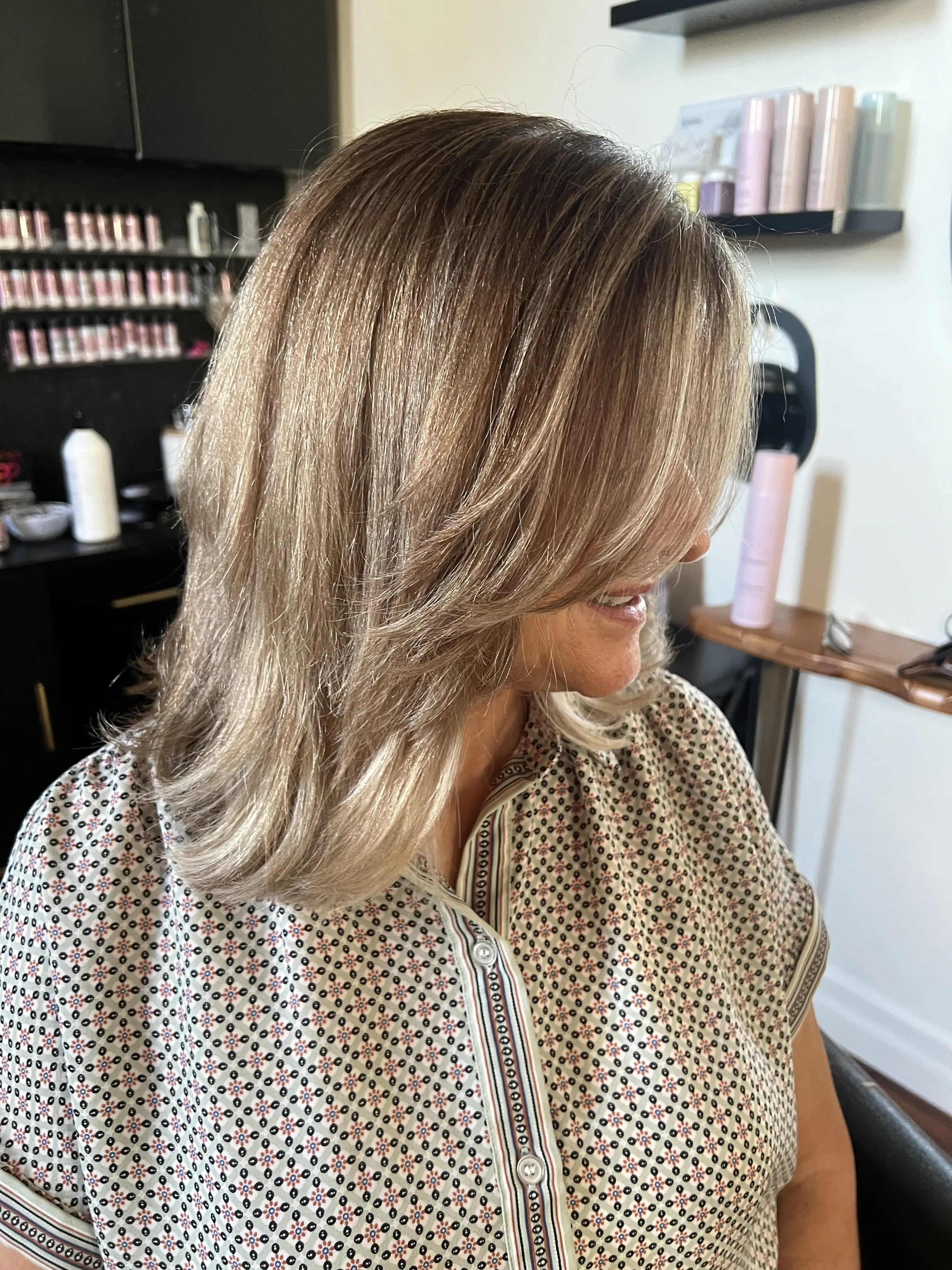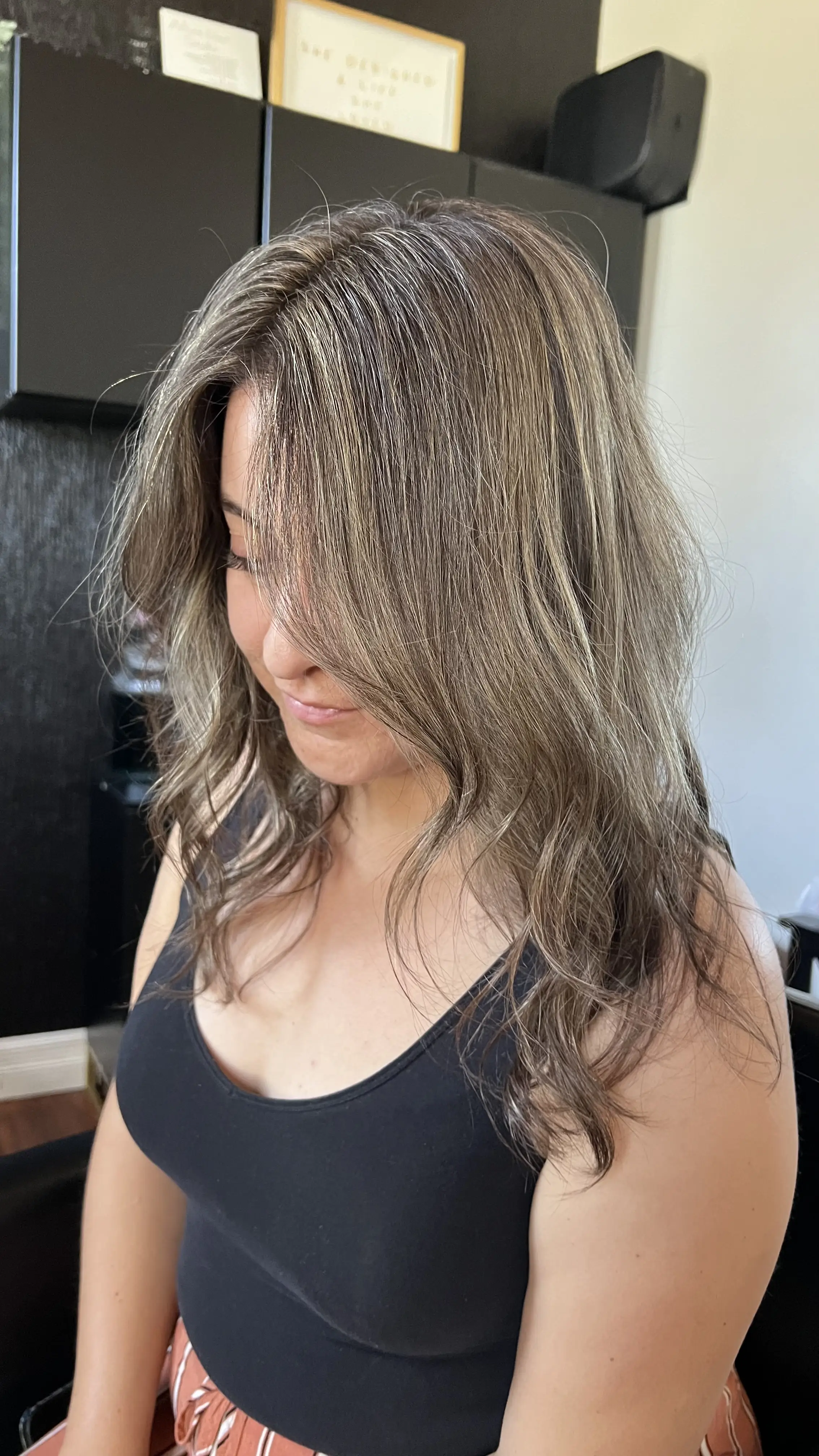 A partial highlight includes the top of the head and sides. This service includes K18, root melt, tone, shampoo & blow-dry.