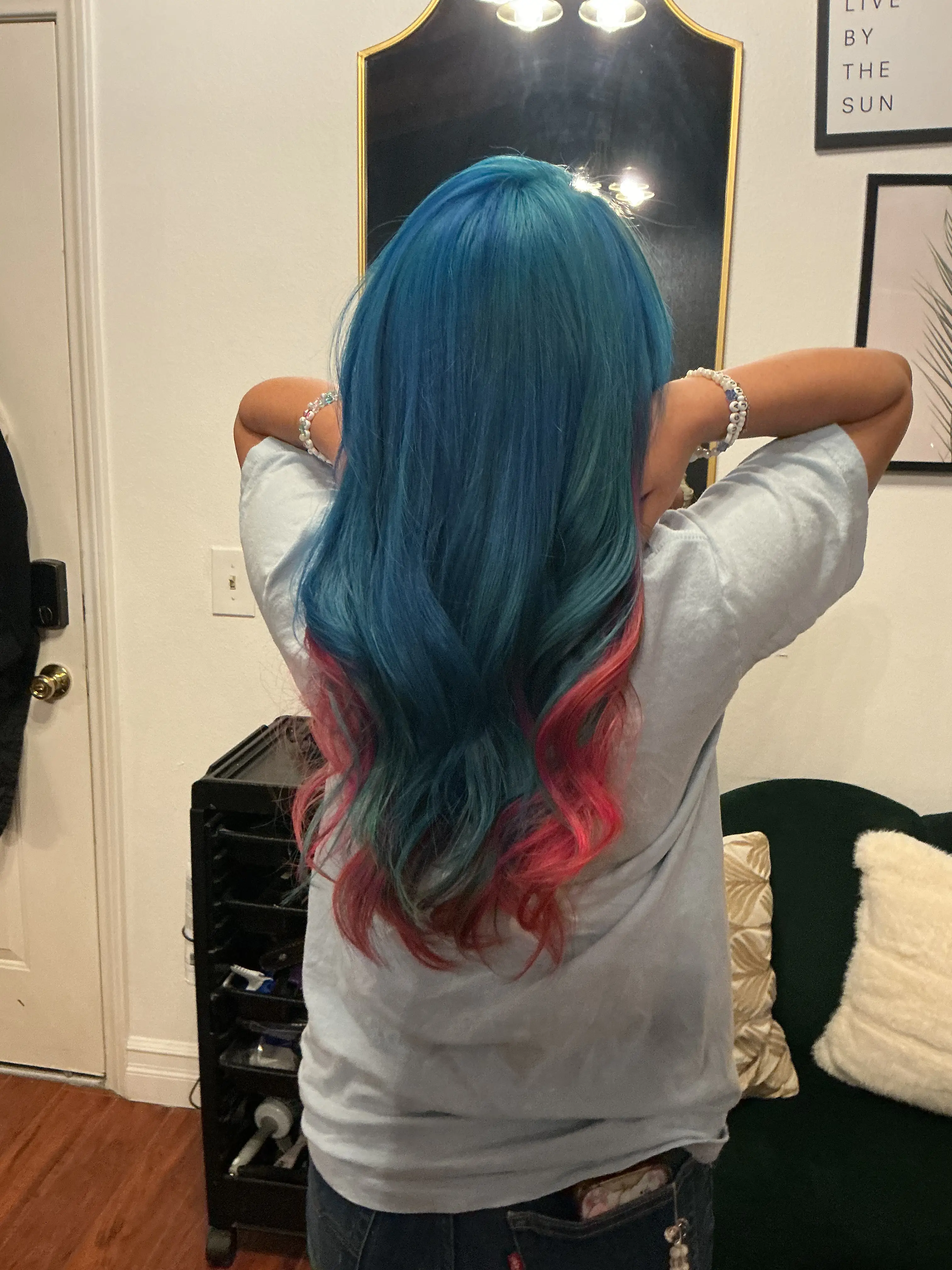 Single process all over color from roots to ends with no lightening with bleach.